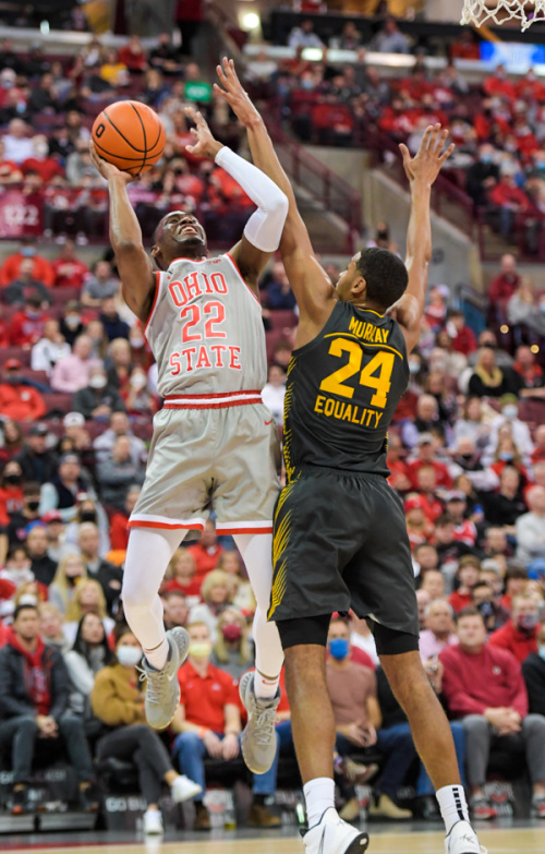 Ohio State’s Malaki Branham goes up for a shot while Iowa’s Kris Murray defends.
