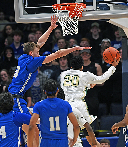 Gilmour Academy's Dorjan Flowers tries a circus shot with St. V's Sencire Harris looming (PressPros Feature Photos Sonny Fulks).