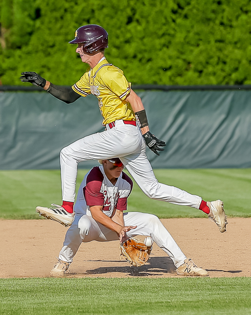 New Albany’s Garrett Given appears to get a game-winning tag right on Westerville North’s Donovan Varney, who was ruled safe.