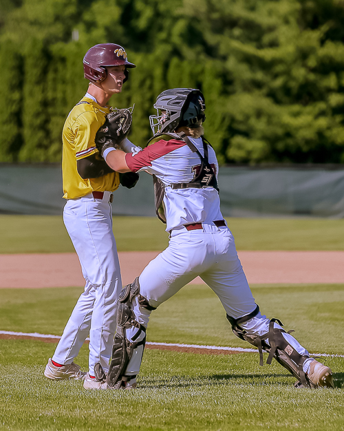 A puzzled Westerville North runner gets tagged out by New Albany catcher Ben Clark.