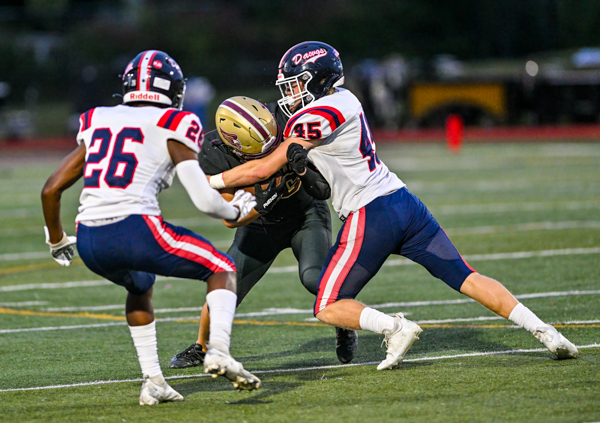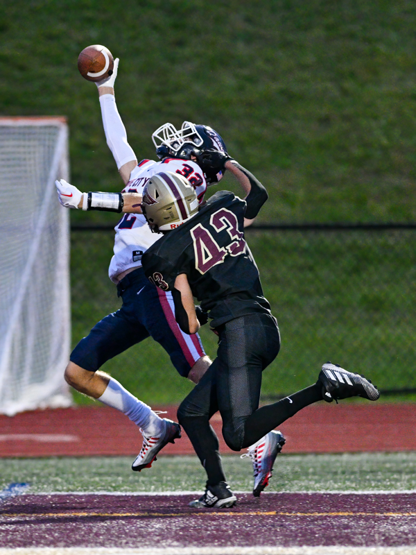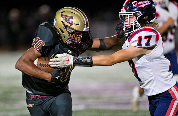 Christian Manville rushed for 230 yards and teammate Dylan Rosser added 165, each scoring two TD, as New Albany countered Grove City’s fast-paced, high-octane passing attack with ball control football. The Eagles’ defense also collected three interceptions and turned a blocked field goal into a TD.