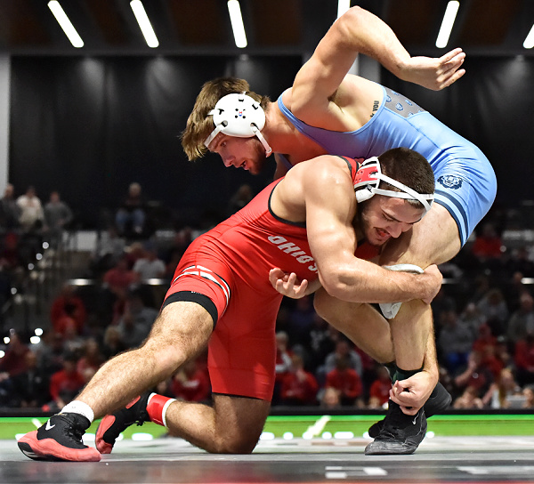 In what was one of the rare close matches of the night, Ohio State’s Jordan Decatur (141 pounds) scored a takedown in the first period against No. 17 Matt Kazimir for an early 2-0 advantage and then held on for a 3-1 decision. Kazimir’s only point came off a stalling warning by Decatur.