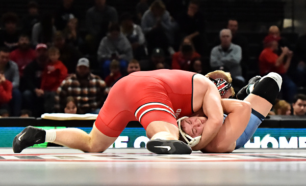 In perhaps the oddest moment of the night, Columbia’s Lennox Wolak, a junior, and graduate of nearby Dublin Coffman High School earned a 8-6 victory over No. 6 Ethan Smith, scoring a late takedown and earning a standing ovation from a large contingent of local friends and family in attendance.