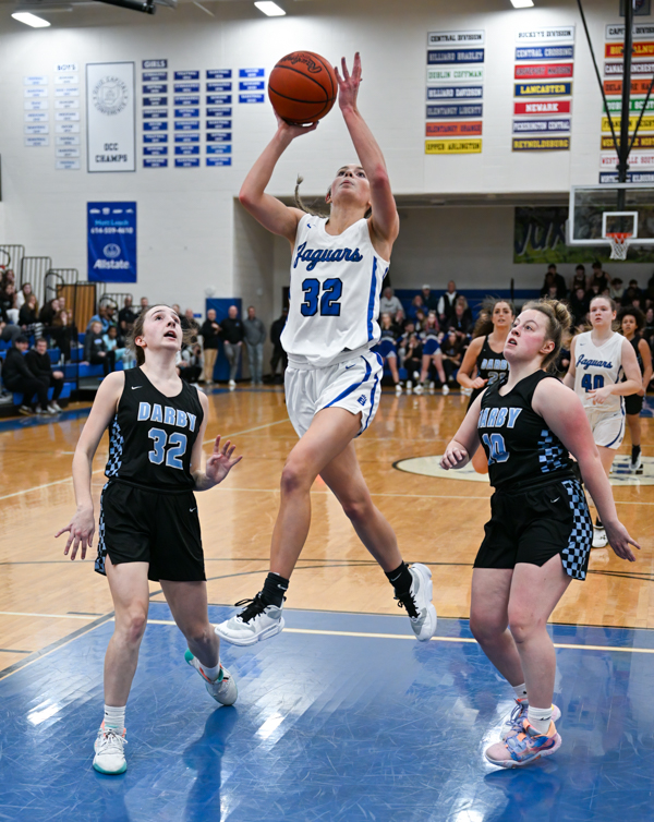 Darby’s Gianna Lane (3) shoots over Bradley’s Emerson Alexander (4) and Reagan Voigt (right).One of Central Ohio’s feel-good stories in girls basketball thus far this season is Darby, which ran its record to 10-1 with a come-from-behind 44-43 win over long-time nemesis Bradley.