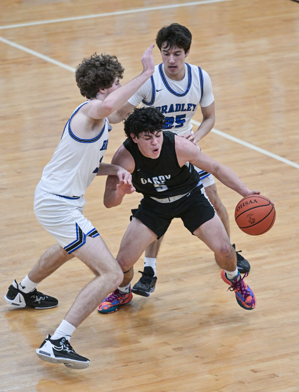 Bradley’s Jeb Bischoff finds a lane to the basket ahead of Darby’s Cam Gilkerson (33) and Kaleb Dotson (2).