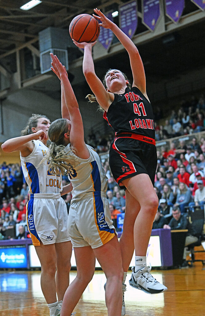 Marion Local’s Mya Eckstein and her teammates felt the pressure all day from Fort Loramie’s defense, applied here by Victoria Mescher.