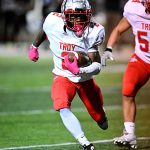 Triple threat…freshman wide receiver Jeremiah Smith looks for a Bronco tackler on this 70-yard catch-and-score in the first quarter.