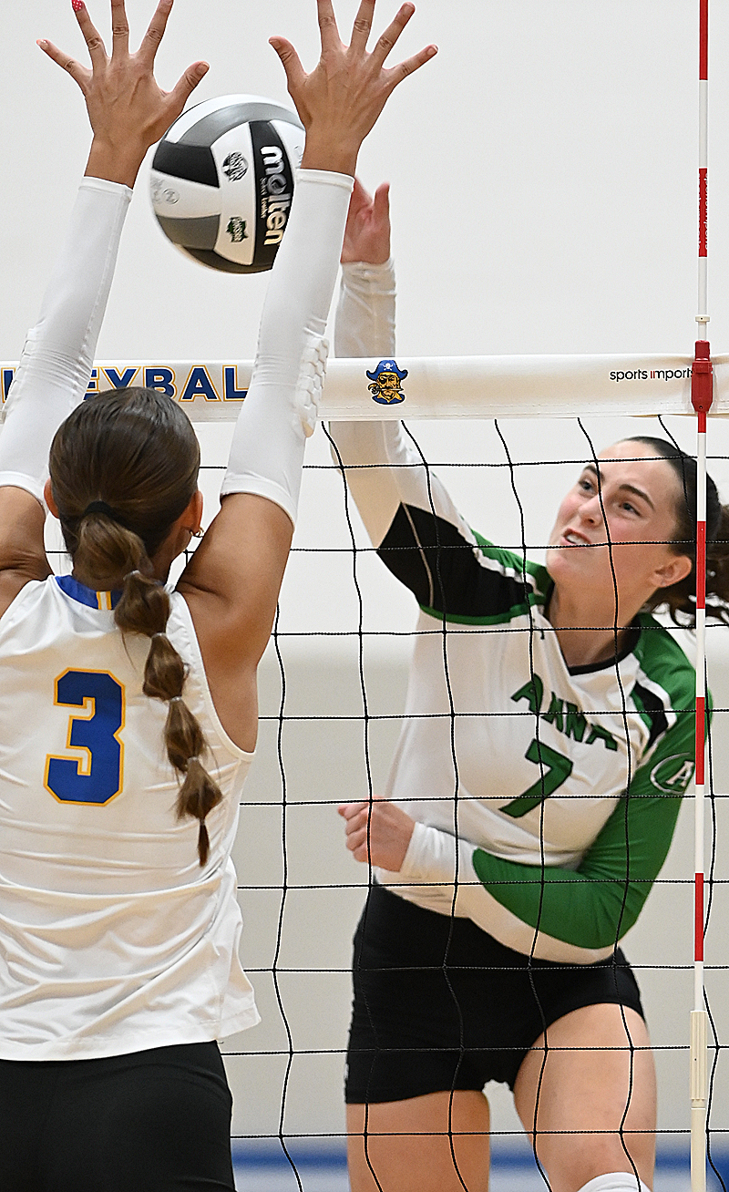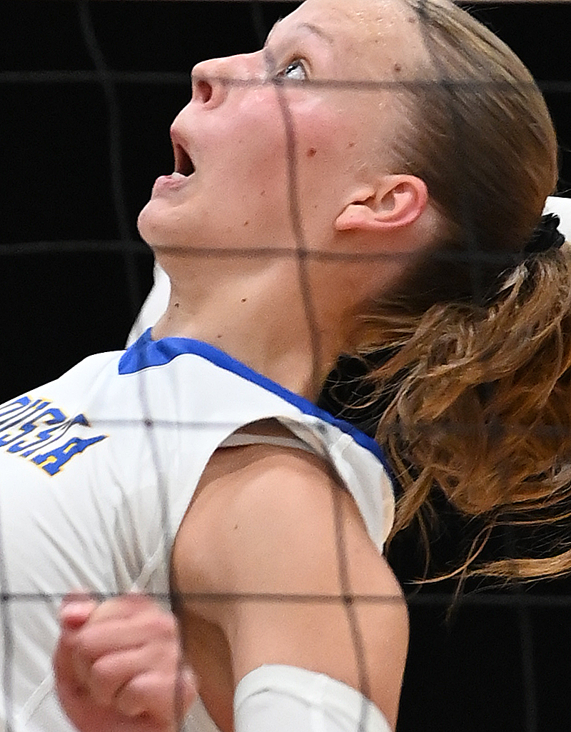 Eyeing the kill…Russia’s Celeste Borchers focuses on a would-be point at the net during Tuesday’s match with the Anna Rockets.
