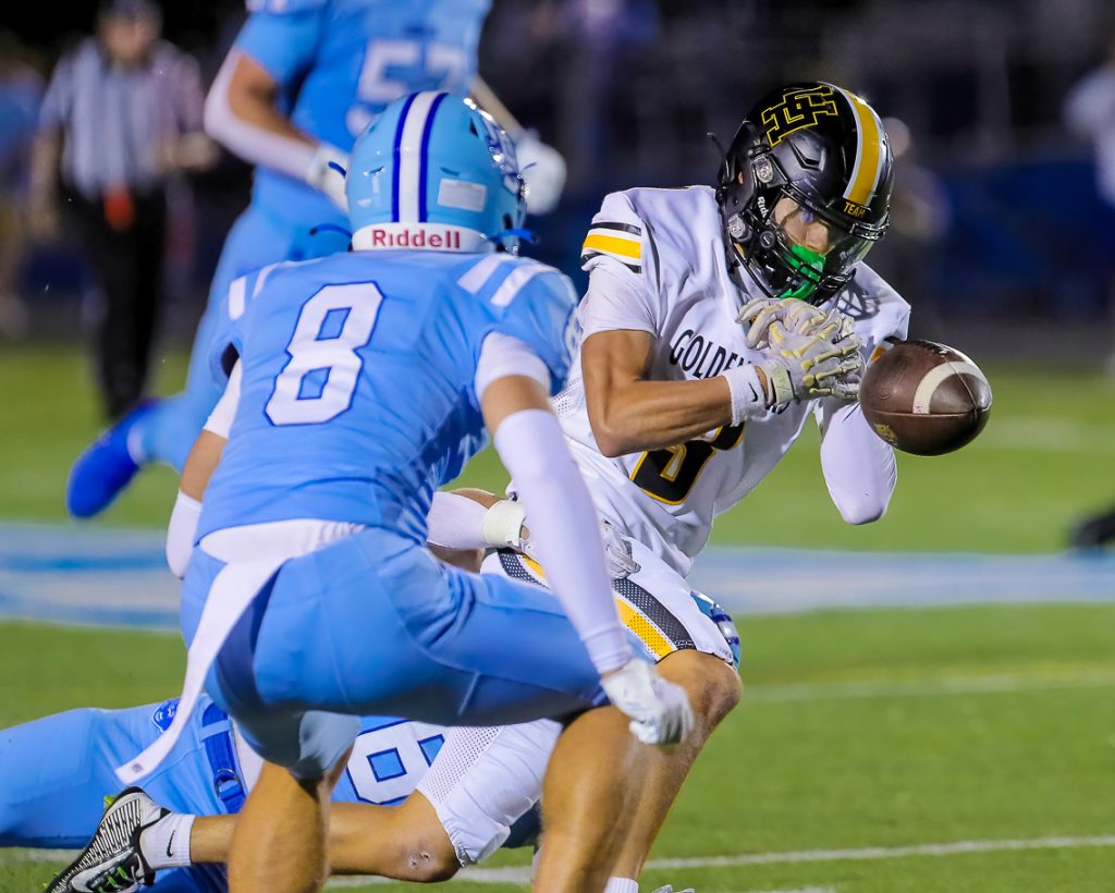 Upper Arlington’s Trent Wolpert makes a spectacular grab for 38 yards to the Berlin 18, setting up the Golden Bears’ second score to extend their lead to 10-0. (Press Pros Feature Photos by Brian Bayless)