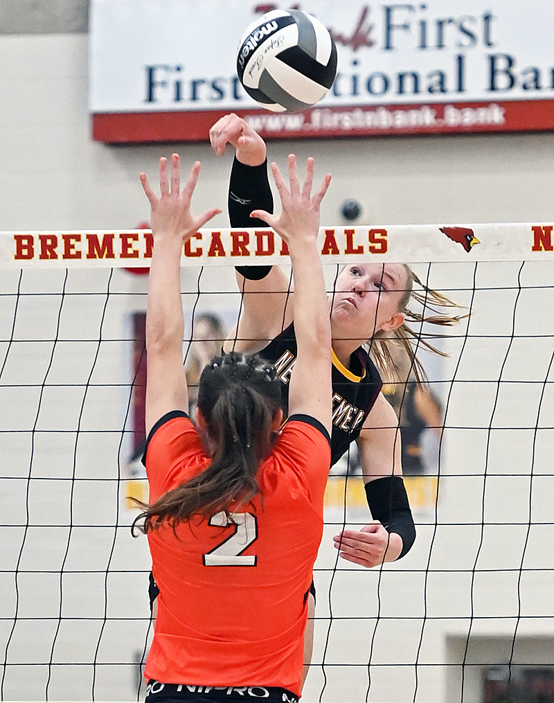 Always aggressive, New Bremen’s early hitting helped them seize the momentum and a two-sets-to-none lead. (Press Pros Feature Photos by Julie McMaken Wright)