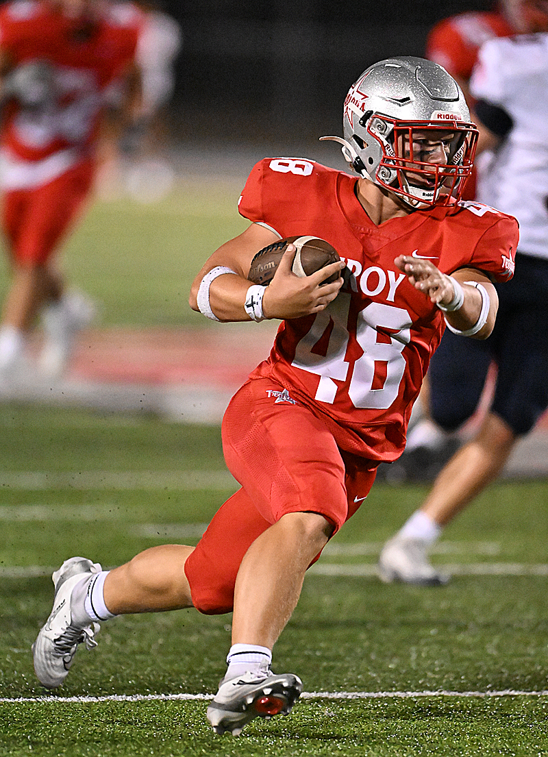 Troy senior Aidan Gorman fumbled twice in the first half, but it didn’t stop him from being a blocker and playing strong defense in the secondary, twice tripping up Knisley as the last line of defense.