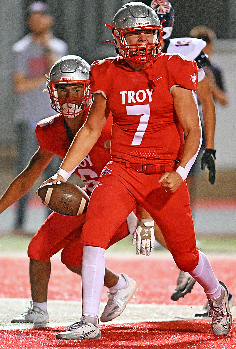 Troy senior Aidan Gorman fumbled twice in the first half, but it didn’t stop him from being a blocker and playing strong defense in the secondary, twice tripping up Knisley as the last line of defense.