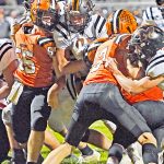 Tipp’s Xavier Melton breaks a tackle on his way to a big gain in the Red Devils’ blowout win over Butler. (Press Pros Feature Photos by Lee Woolery)