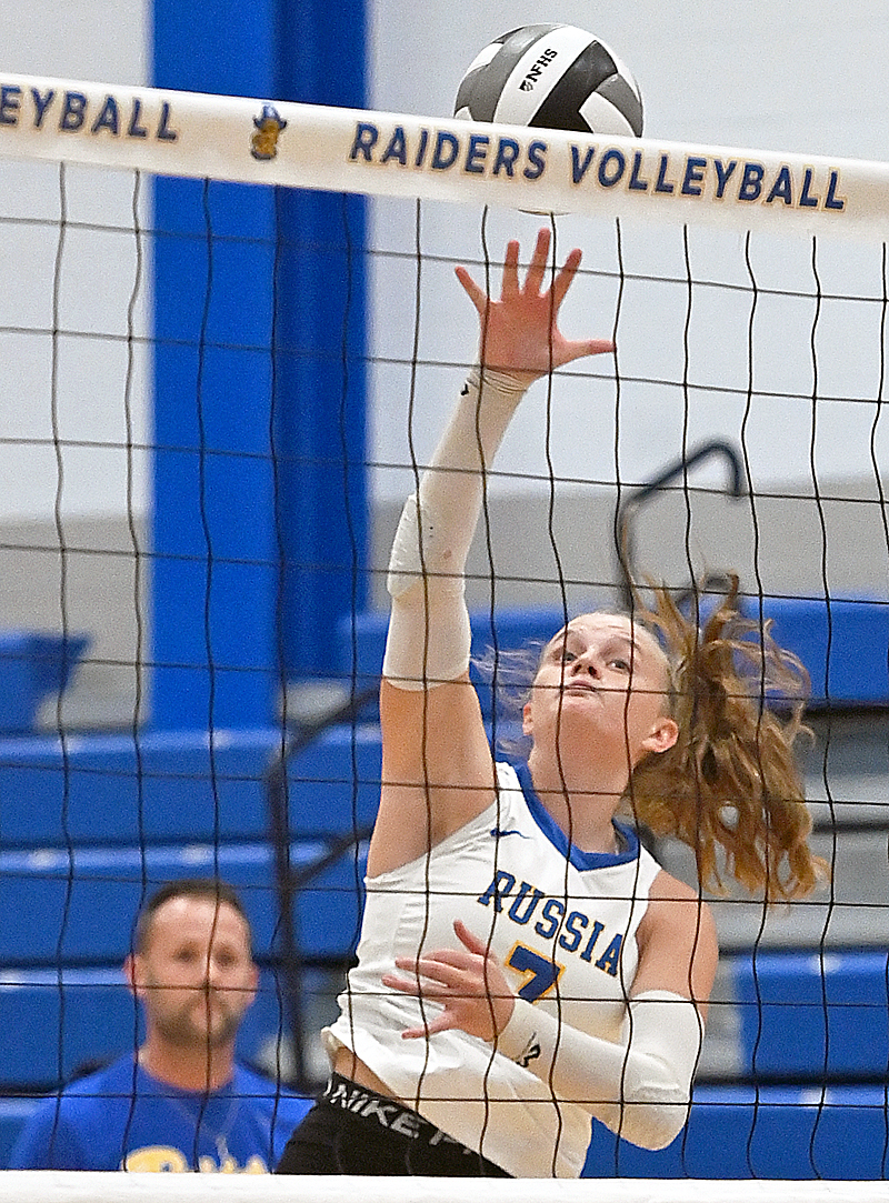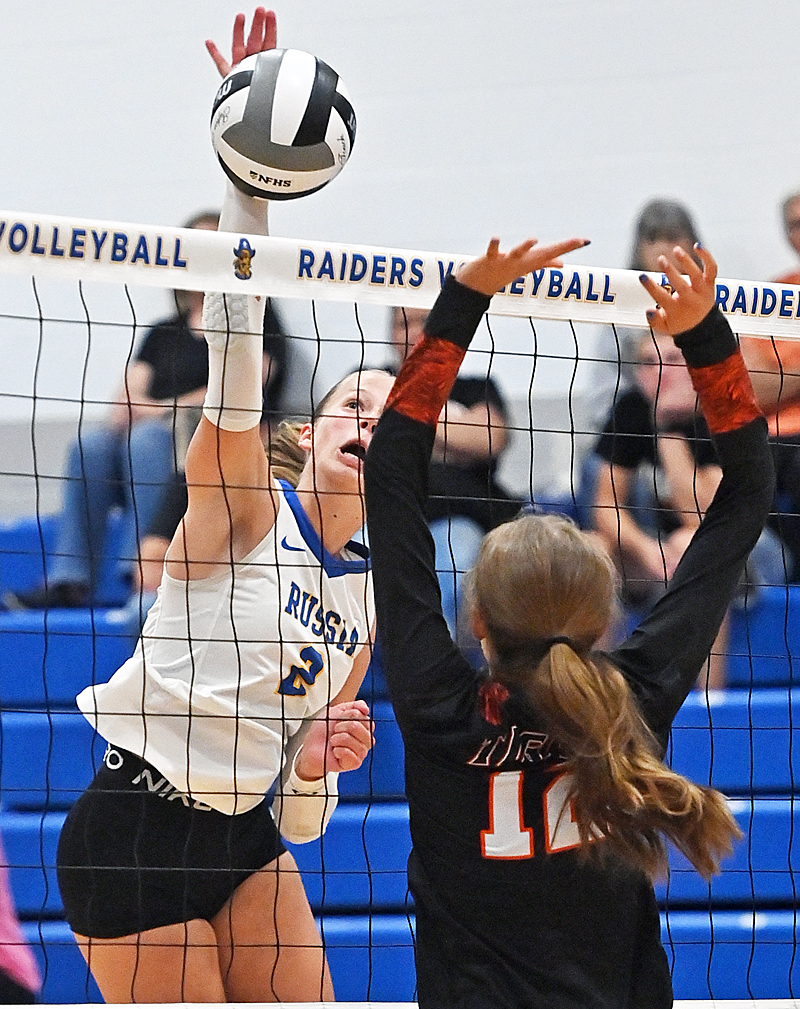 Russia’s Celeste Borchers scores a kill during Tuesday’s SCL win over Jackson Center.