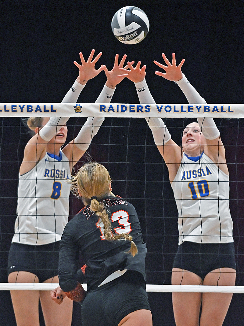 Russia’s Ava Gibson (#8) and Ruby Francis gang up on the shot attempt of Jackson Center’s Tatum Reichert. (Press Pros Feature Photos by Julie Wright Daniel)