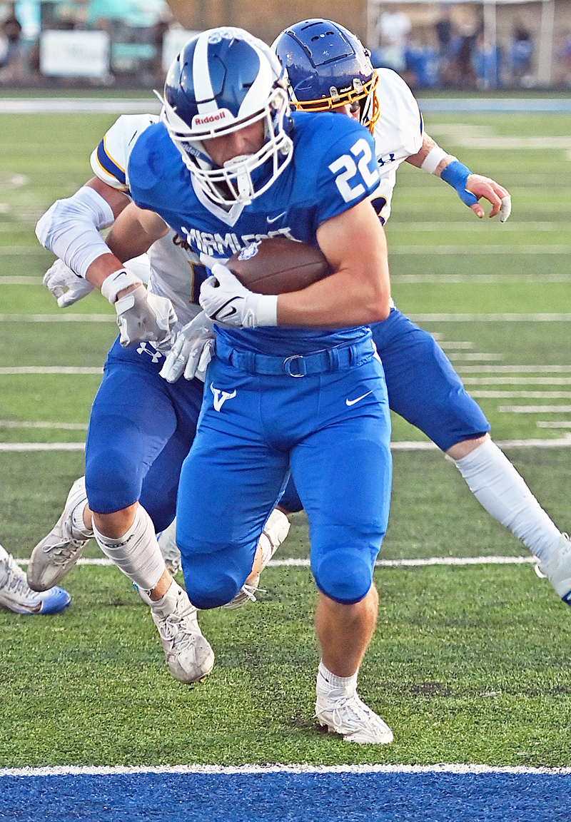 Viking Brandon Stone drives for the first touchdown of the night. (Press Pros Feature Photos By Julie Wright-Daniel)