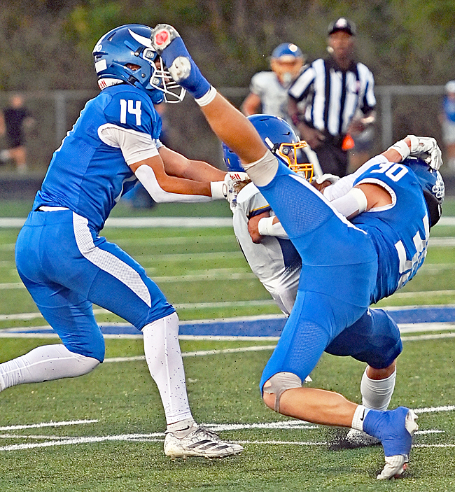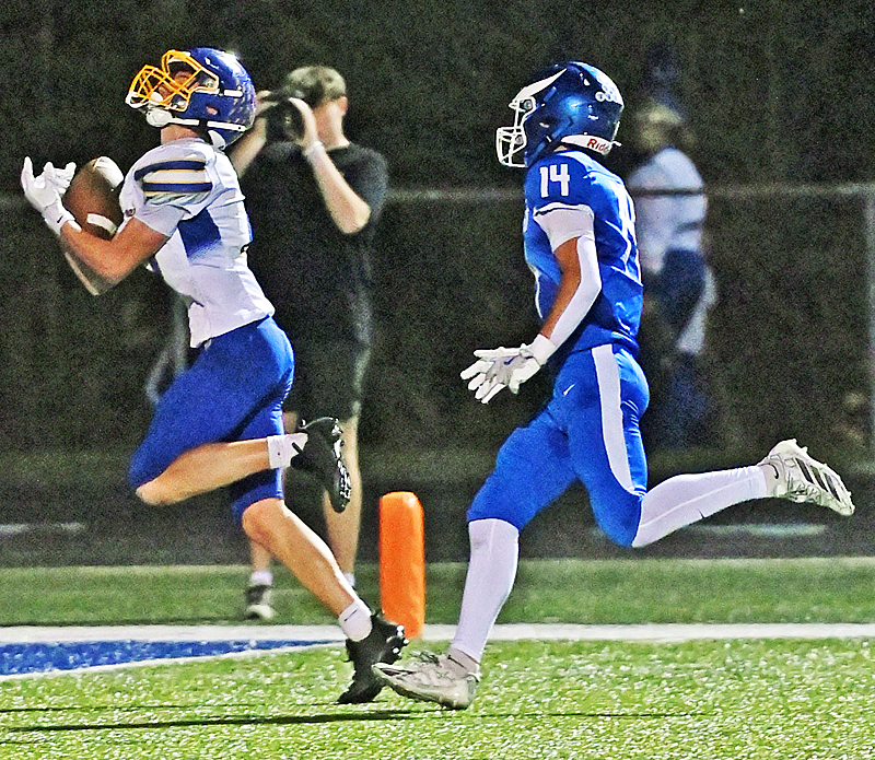 Lehman’s Gus Richard hauling in one of Turner Lachey’s bombs with Jack Hamaker on his tail.