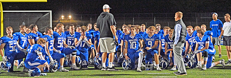 Coach Hunter Folkertsma having a victory talk with his team after the 51-32 win over the Lehman Cavaliers.