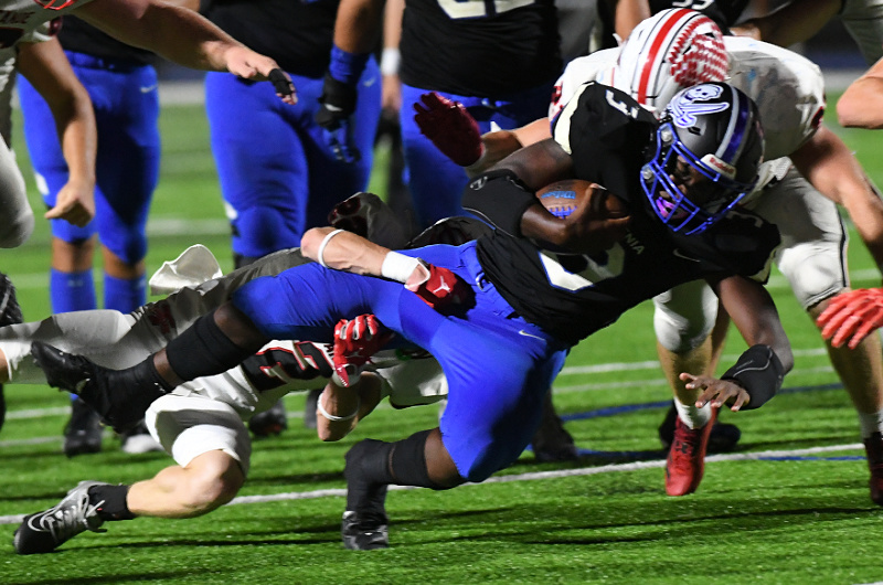 Always falling forward, carrying defenders with him, Xenia’s Deaunte White rushed for one TD and 195 yards to become his school’s career rushing leader (PressPros Feature Photos by Sheri Hooley).
