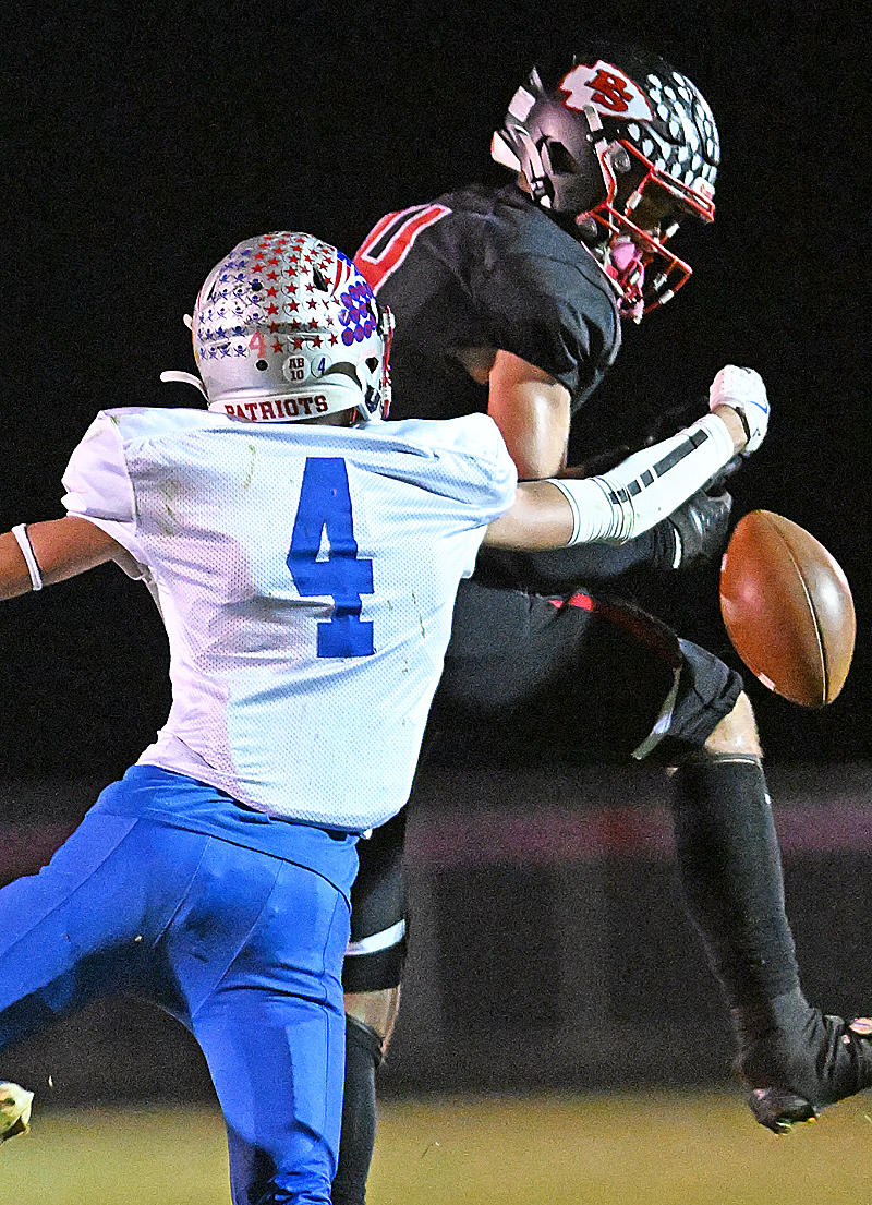 Tri-Village defensive back Griffin Richards punches this pass out of the grasp of Preble Shawnee’s Caleb Blankenship.