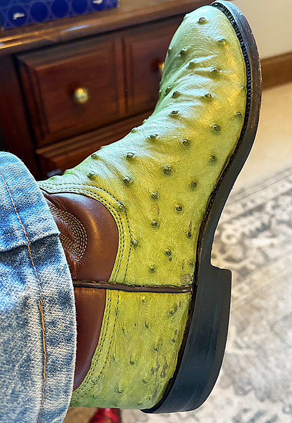 He took me by surprise. I wasn’t even aware of his sitting next to me. But it wasn’t the first time people had asked about the pair of boots I was wearing – lime green ostrich, handmade by a friend named James Morado, a bootmaker I met three years ago in Houston, Texas.