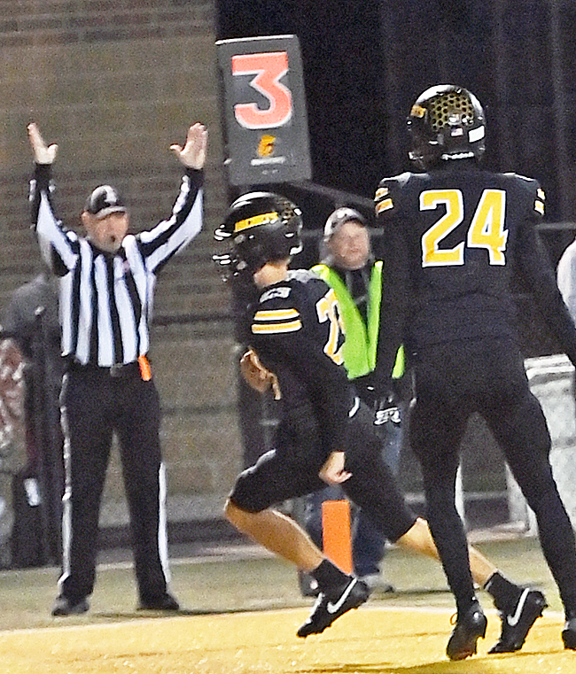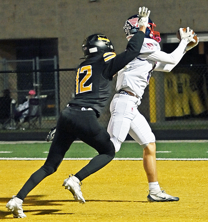 Indian Keaton Fisher (19) hauls in a touchdown pass from quarterback Chris Davis. (Press Pros Feature Photos By Julie Wright-Daniel)