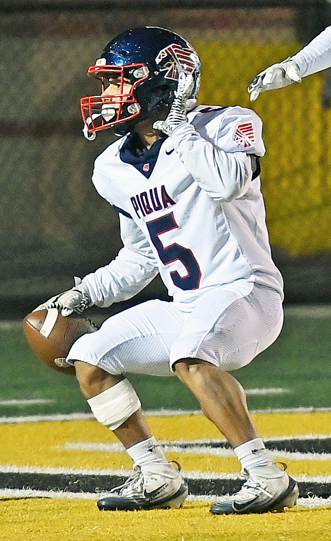 First he hit Keaton Fisher with a swing pass in the flat to give Fisher a running start down the Piqua sideline for a 72-yard touchdown pass that extended the visitors’ lead to 28-20 with 9:58 to go.
