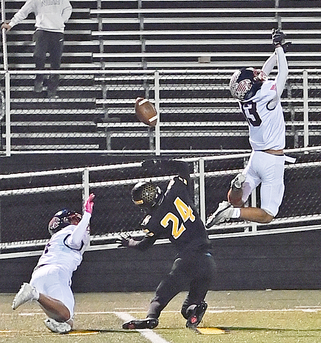 Defensive back Jay’Zail Hancock (13) breaks up an attempted pass that was meant for Sidney’s wide receiver Davis Burks (24).