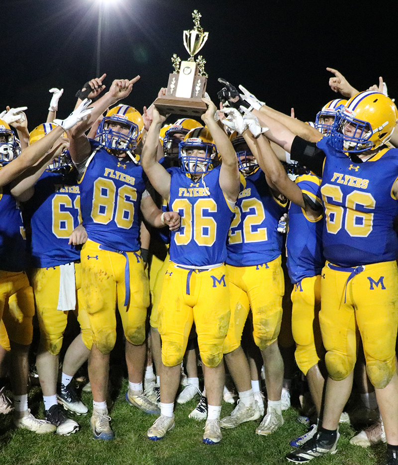 Marion Local’s Kamden Eifert (36) and his teammates celebrate with the MAC championship trophy. The Flyers have won eight straight titles, including the last five outright. (Press Pros Photos by Christy Wilker)