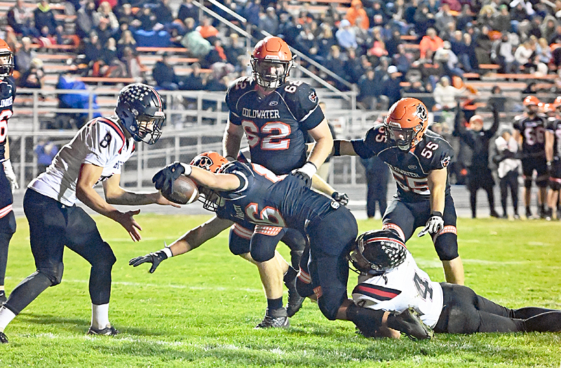 Coldwater’s Karter Freed reaches for extra yardage on a night when Covington couldn’t stop the Cavaliers from gaining whatever they needed.