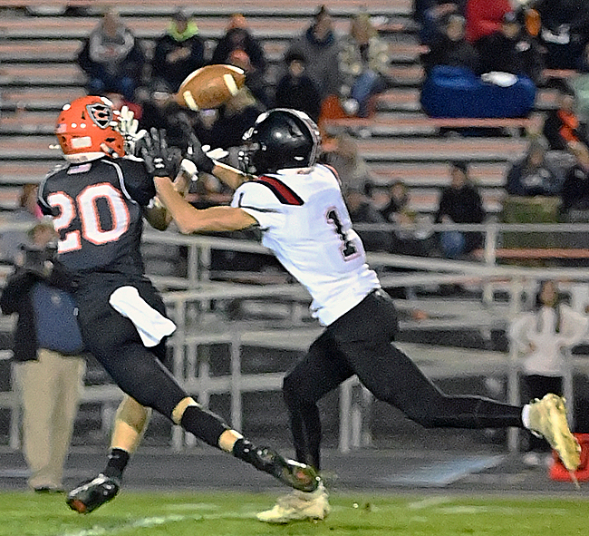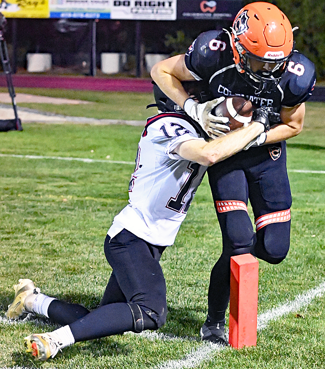 Coldwater’s Cadin Obringer catches a 12-yard touchdown pass from Caleb Schroer late in the first half as Covington’s Filip McMaken tries to break up the pass.