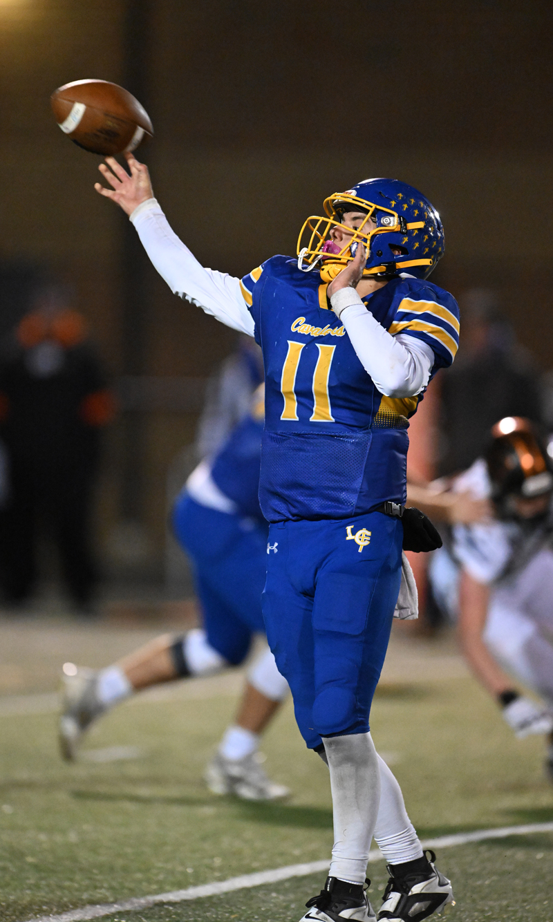 Lehman quarterback Turner Lachey launches a touchdown pass during Friday’s surprise playoff win over Minster. (Press Pros Feature Photos by Lee Woolery)