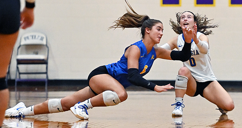 Kourtney Phlipot (0) and Violet Armstrong (6) sacrifice for a save for the Raiders.