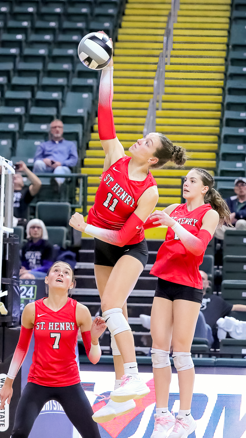 Like New Bremen faced with Newark Catholic a couple of hours earlier, Independence proved to be a bit of a matchup problem with the person of senior hitter Haley Wilson, a 6′-plus dynamo who finished with 17 kills for the match and proved to have unerring accuracy with her laser-like shots over the net and at the feet of St. Henry defenders.