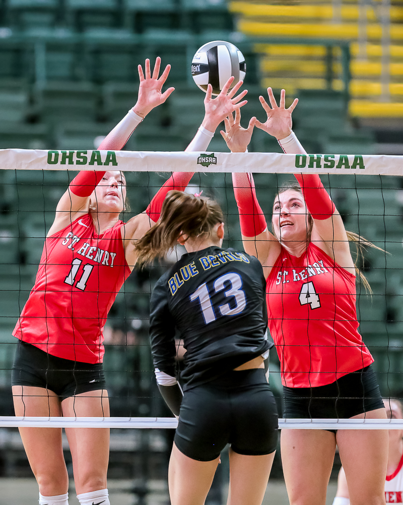 St. Henry’s Karlee Buschur and Molly Wendel close down on Independence hitter Glada Spisak in Thursday semi-final match at the Nutter Center.