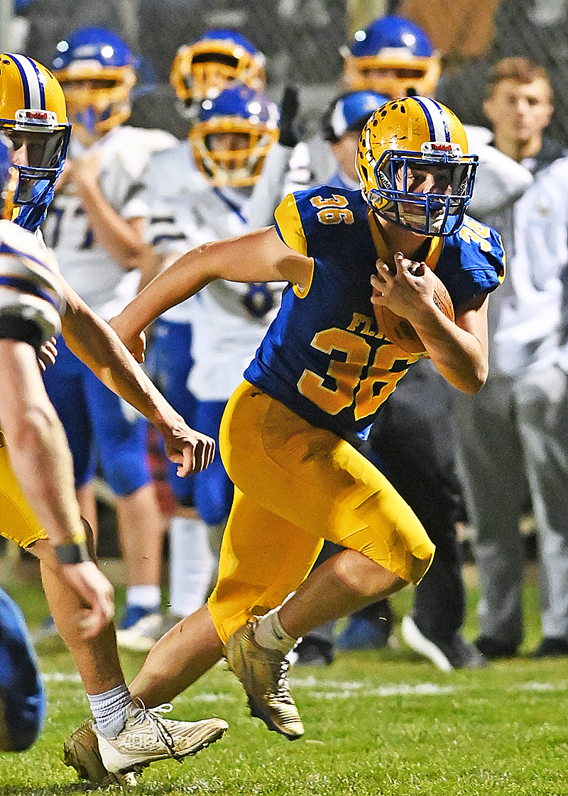 Marion Local’s Kamden Eifert runs for one of his three touchdowns in Friday’s 42-12 win over Lehman. (Press Pros Feature Photos)