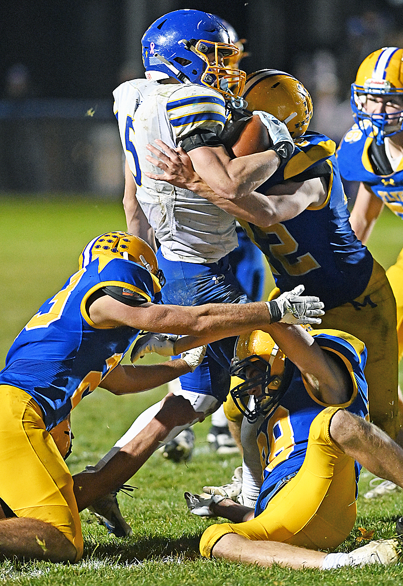Marion Local’s defense pinched Lehman’s Evan O’Leary during action in Friday’s 42-12 win.