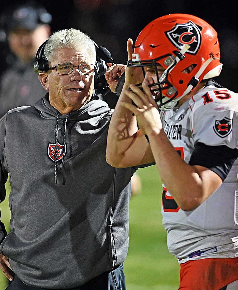 “You have to go score again,” says coach Chip Otten to quarterback Karsyn Homan. Tri-Village refused to quit on offense in the second half.