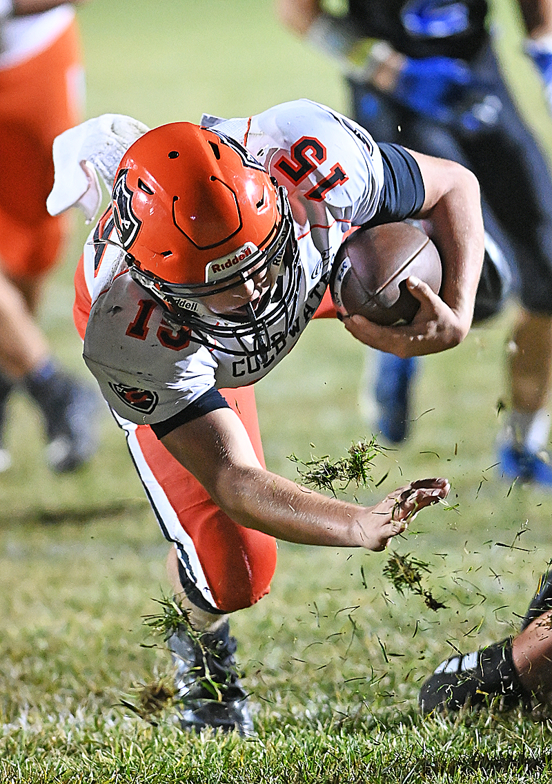 Coldwater quarterback Karsyn Homan lunges for one of his three touchdowns in Friday’s regional semi-final win over Tri-Village. (Press Pros Feature Photos)