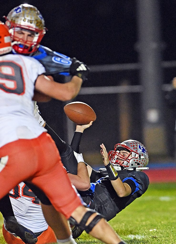 Hardest way to throw a football…Coldwater got pressure on Tri-Village Trey Sagester.