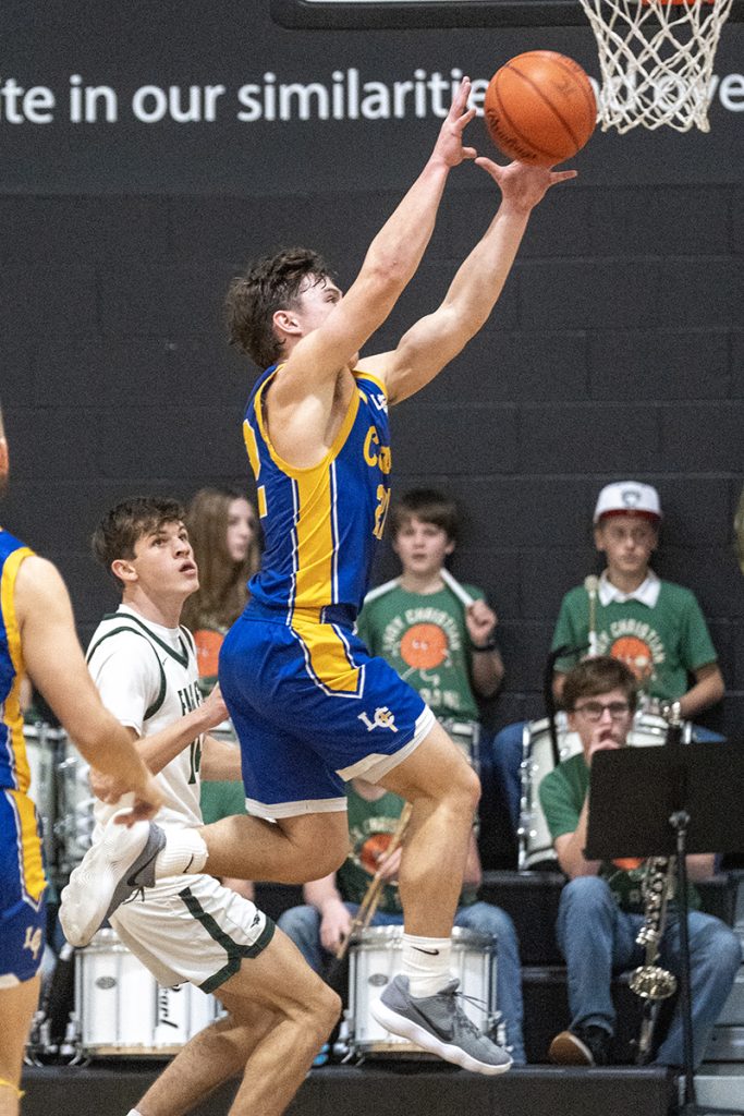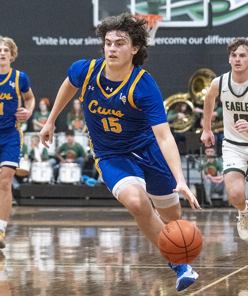 Lehman Catholic’s Braden Ulbrich is stepping into his new role as starting point guard. He scored 10 points and made the winning free throw. (Press Pros Feature Photos By Logan Howard)