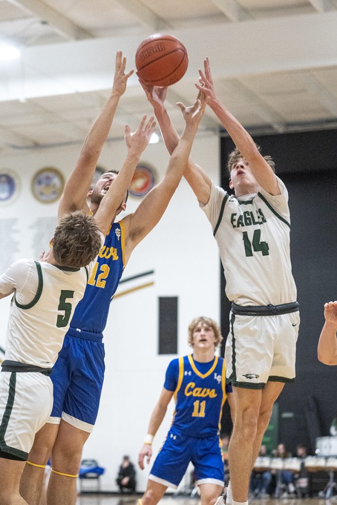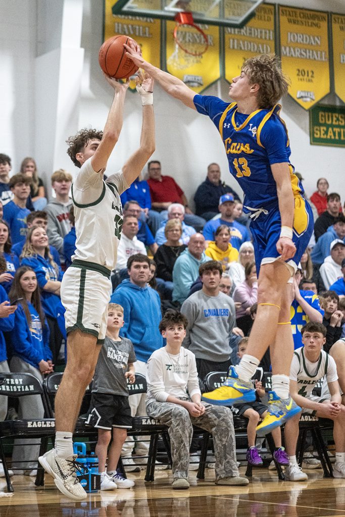After both teams battled through eight first-half ties with hard defense and some sloppy offense, the second half erupted into the game everyone came to see. Riston Taylor (22 points) and Noah Fecher (18 points) opened the second half with 3-pointers in the first minute to stake the Eagles to a 24-18 lead, the largest for either team.