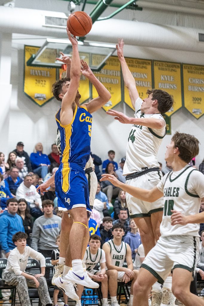 Lehman Catholic’s Shane Frantz was defended tightly all night. But his 13 third-quarter points put the Cavaliers in position to win.