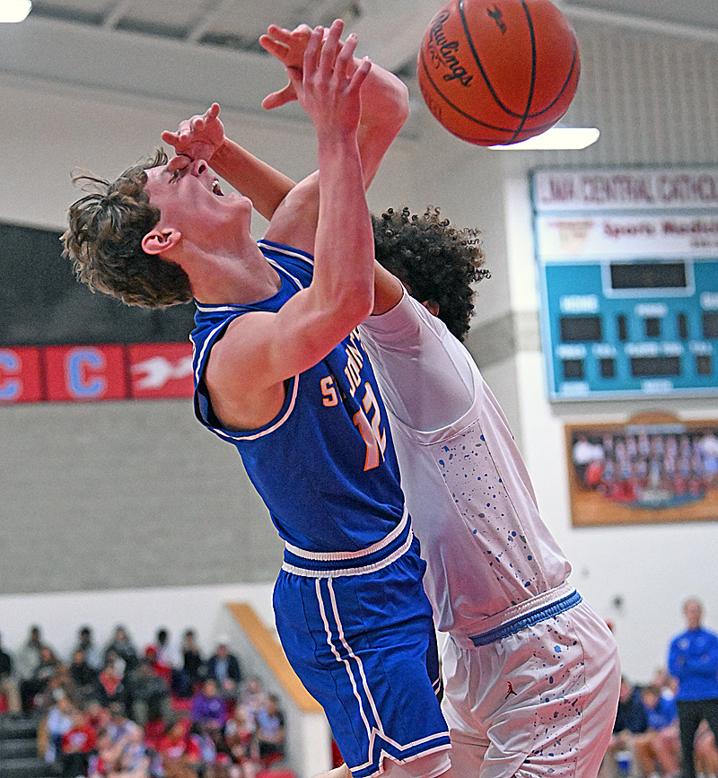 Delphos St. John’s Andrew Elwer gets smacked in the face by an LCC defender during Sunday’s showcase matinee in Lima. “Our response at different times was just a credit to our guys and their overall toughness.” – Delphos St. John’s coach Aaron Elwer
