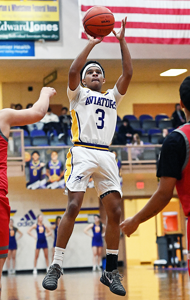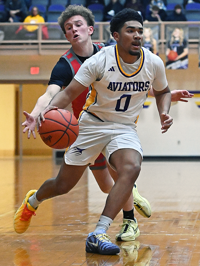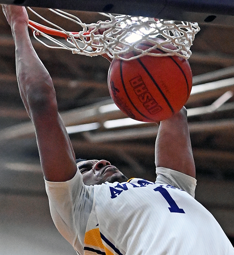 Julius Rusk Flushes a fast break dunk. His three steals each led to Aviator baskets.