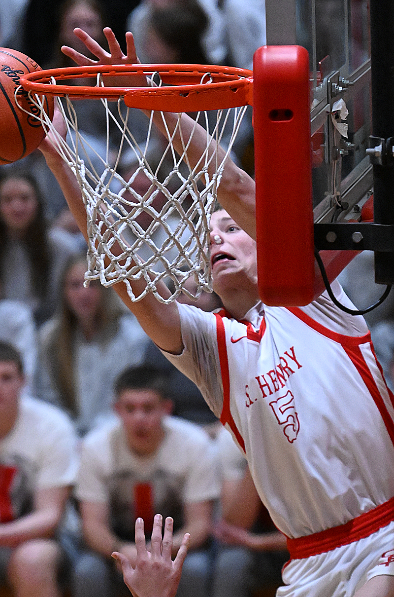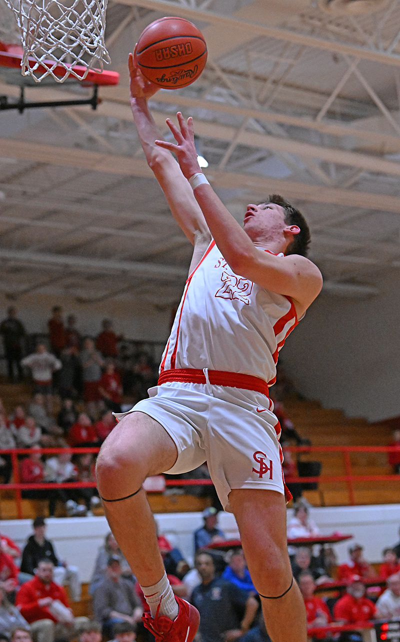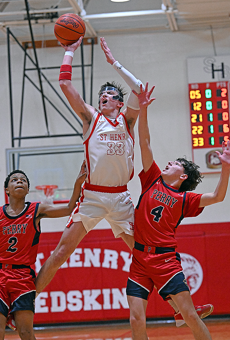 St. Henry’s Austin Zimmerman gets to the rim for two of his co-team-high 14 points in the win over Perry.