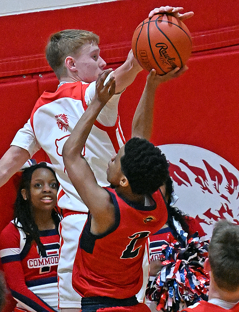 Keith Siefring reaches back to block the shot attempt of Perry’s Zyan Dukes-Tisdale.