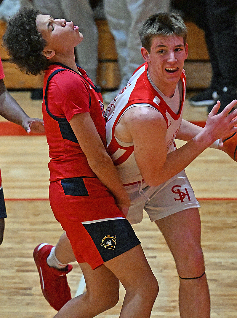 Ouch, that stings…Perry’s Dakari Boroff takes the brunt of the contact trying to stop baseline drive to the rim.