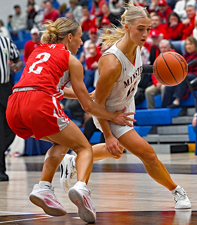 Kali Schmiesing scored a fast break layup off a steal to at least end Minster’s scoring drought, though Albers had a chance to cut further into the lead and missed two free throws.