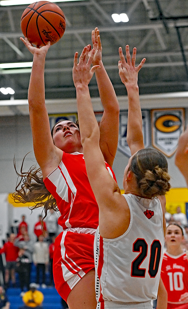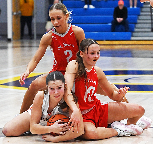 The next time down the floor, St. Henry added two more crucial second-chance points when Alexis Buschur darted in to grab Karlee Buschur’s errant 3-pointer and put it right back up for a 35-23 lead with under three minutes to go.